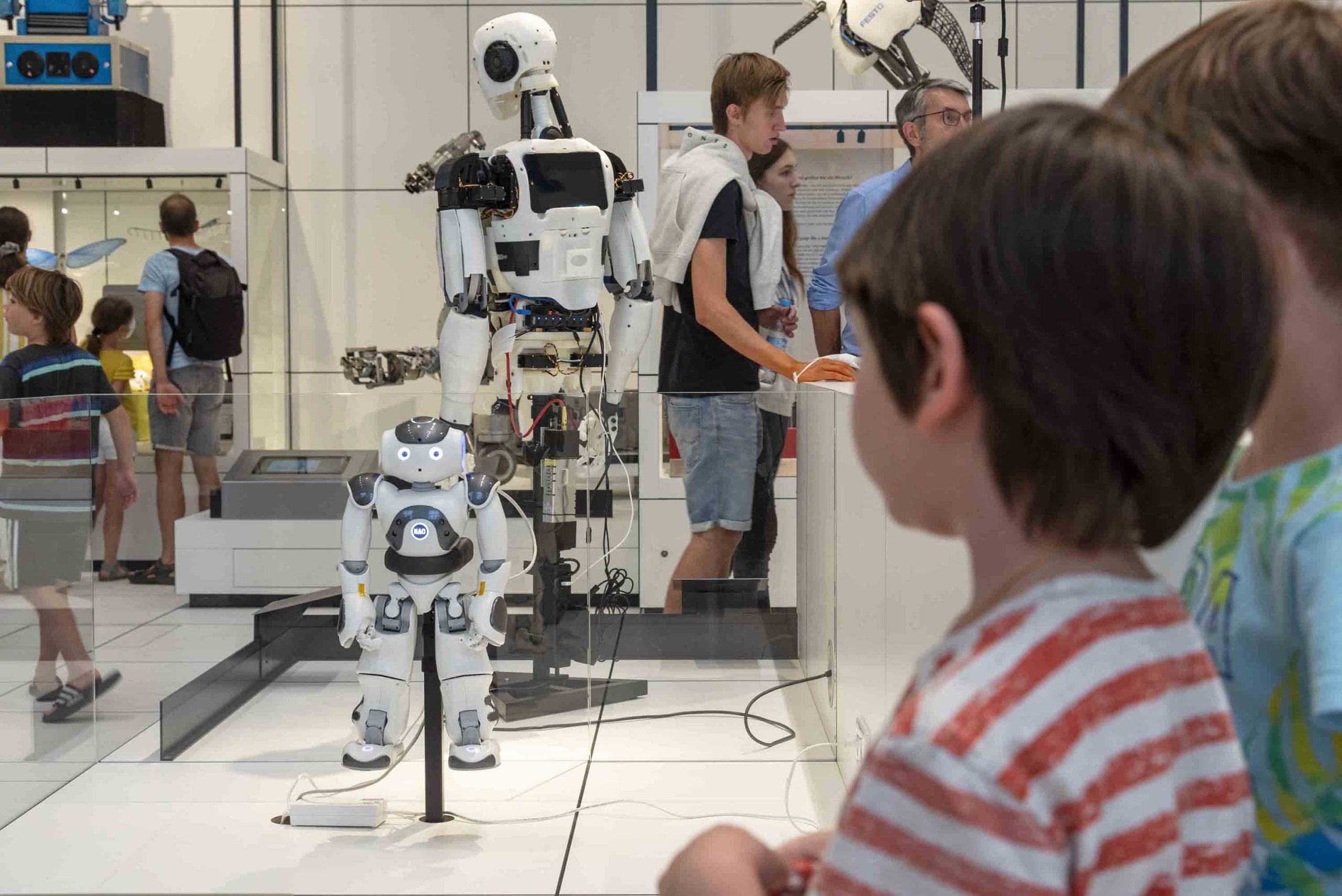 The world of artificial beings is bright. The narrow, dark lines that form a grid across the floor, walls, and ceiling initially create the impression of a virtual space. In reality, however, these machines that serve are now part of everyday life: Dedicated themed areas within the robotics exhibition explore applications in care and medicine, households, edutainment, industry, and robots in extreme environments.