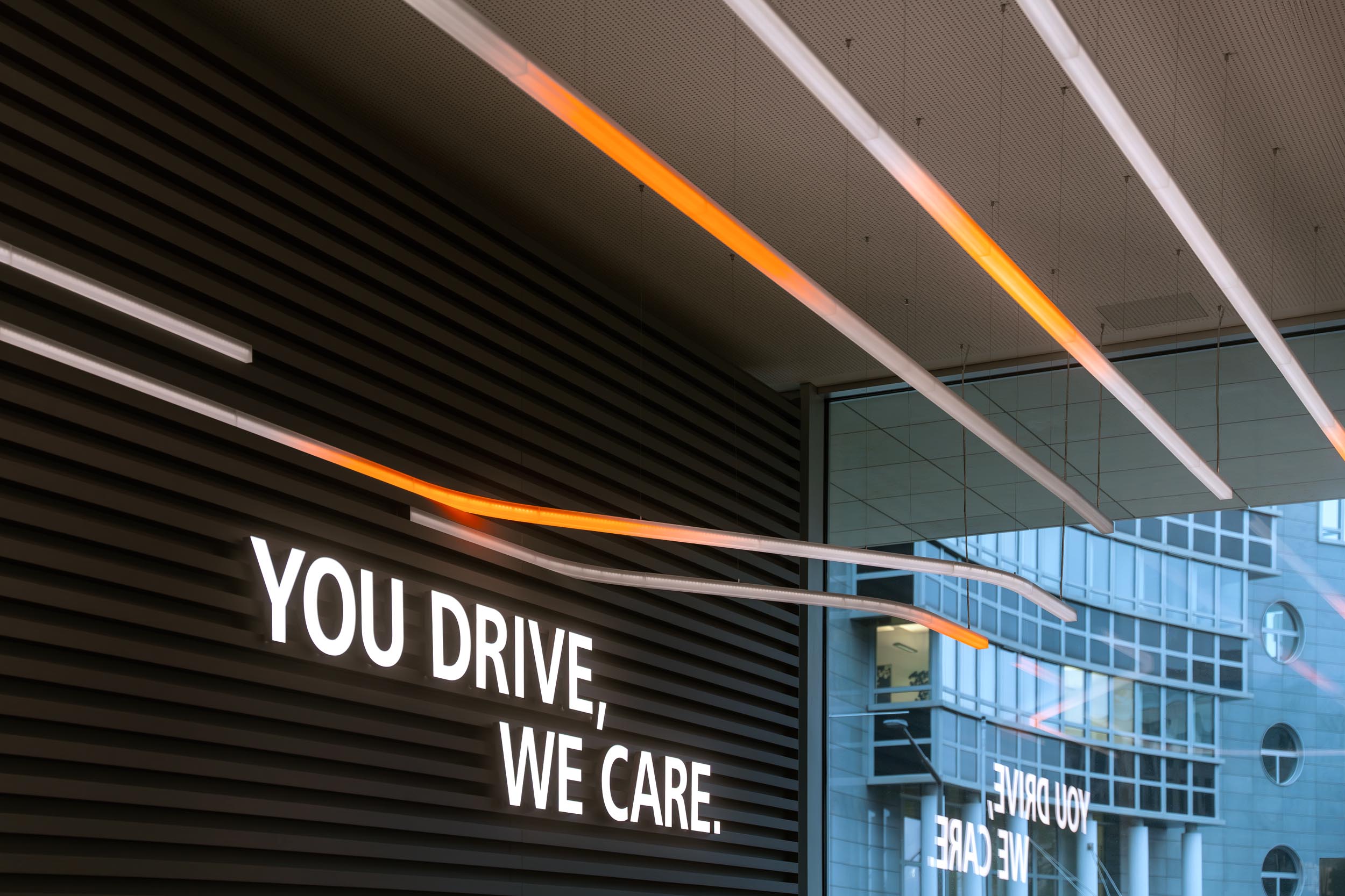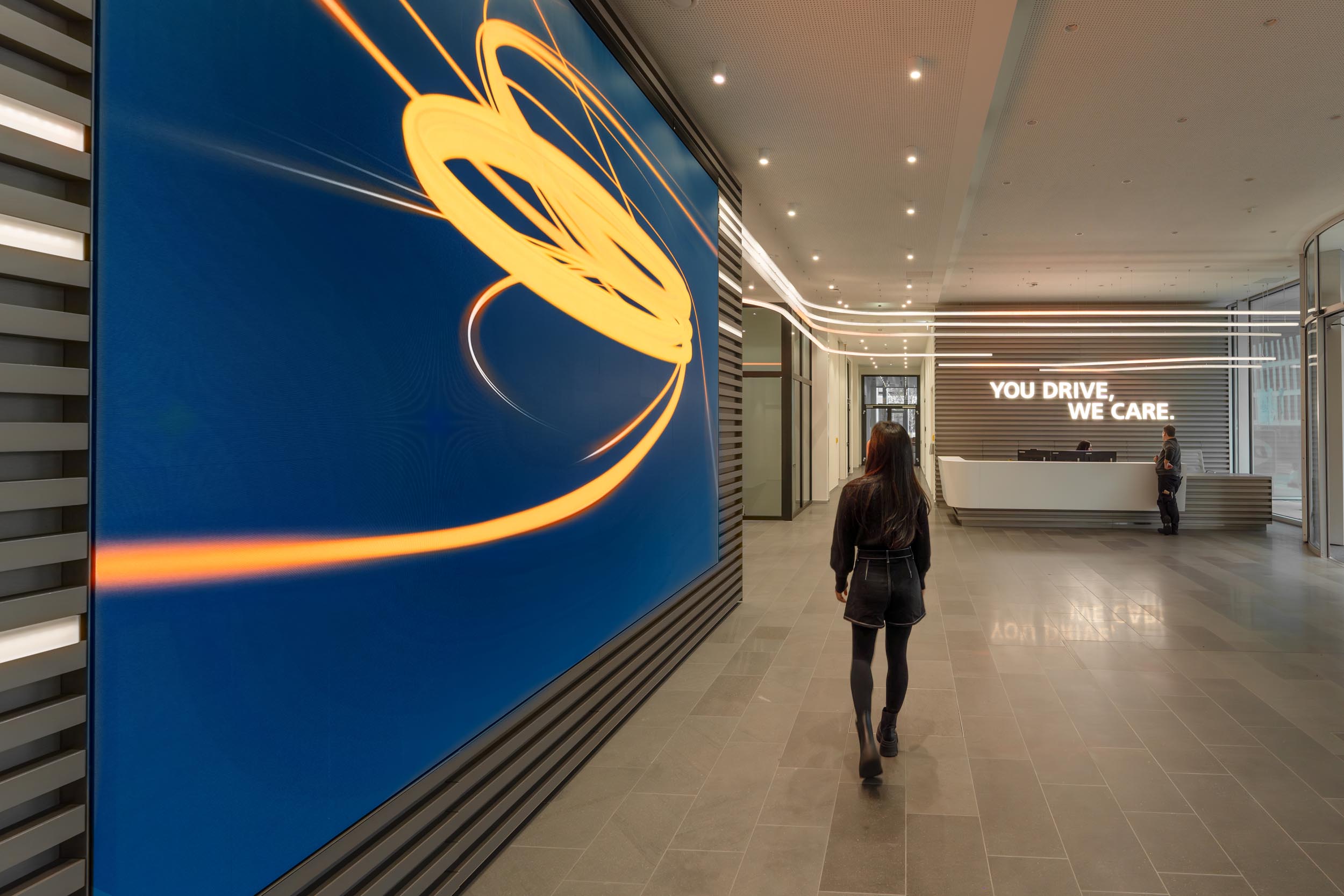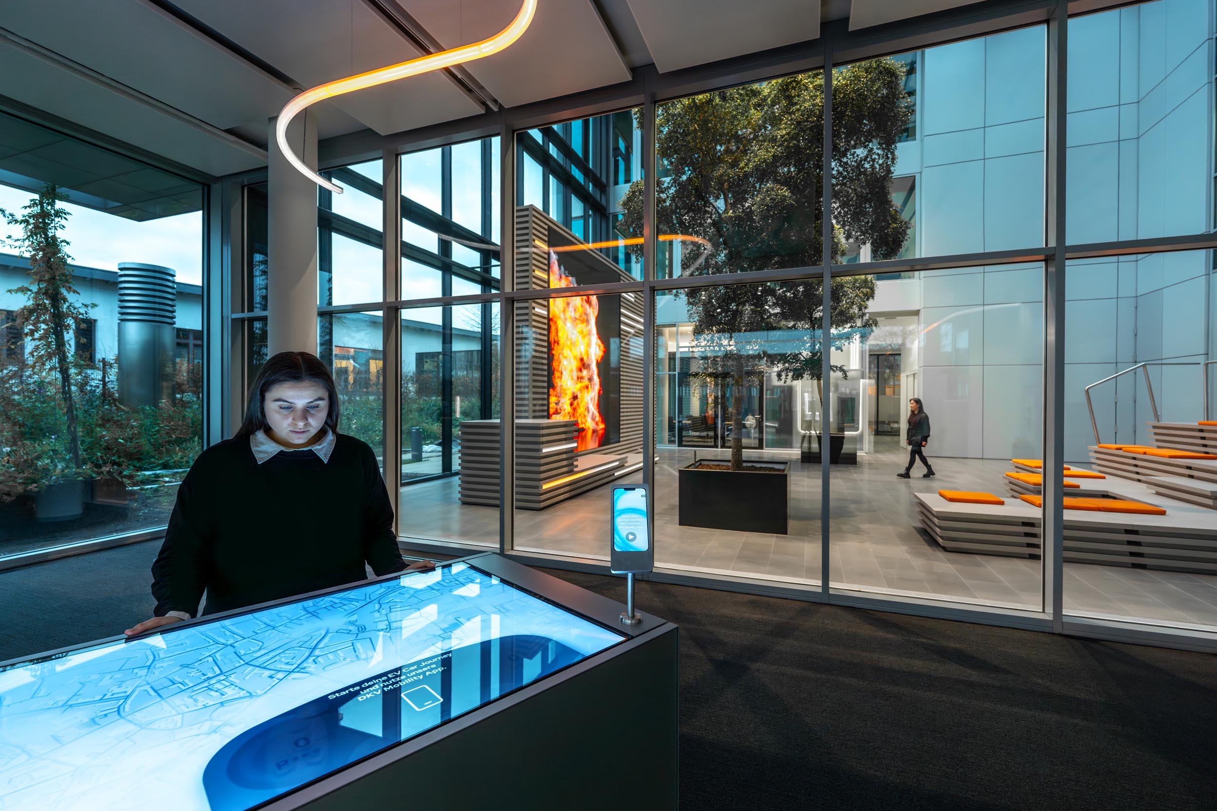 The central design element in the DKV Visitor Center is the DKV Spark. It guides visitors through DKV World at the company headquarters in Ratingen. The pulsating line of light leads from the foyer, through the “DKV History” exhibition, to event and lounge areas. It connects the spaces and integrates large-format displays. A powerful stream of light.