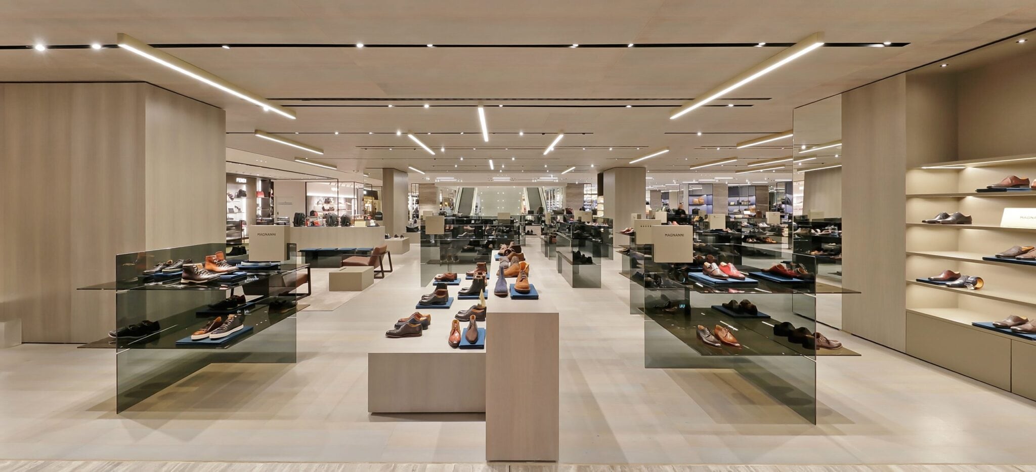 Den Quadranten des aktuellen Umbaus, auf dem Männer ihren Look ab jetzt mit Schuhen und Accessoires ergänzen können, wurde von Storage Milano entworfen. Den typischen milanesischen Hang zu funktioneller Architektur haben die Baukünstler beibehalten, ihn jedoch mit dem richtigen Maß sinnlicher Elemente gebrochen: „Shopping soll mit allen Sinnen stattfinden können“, so ihre Überzeugung für die erste Etage, die mit viel Platz zum Verweilen das persönliche Erleben der ausgesuchten Kollektionen so intensiv wie nie ermöglicht.