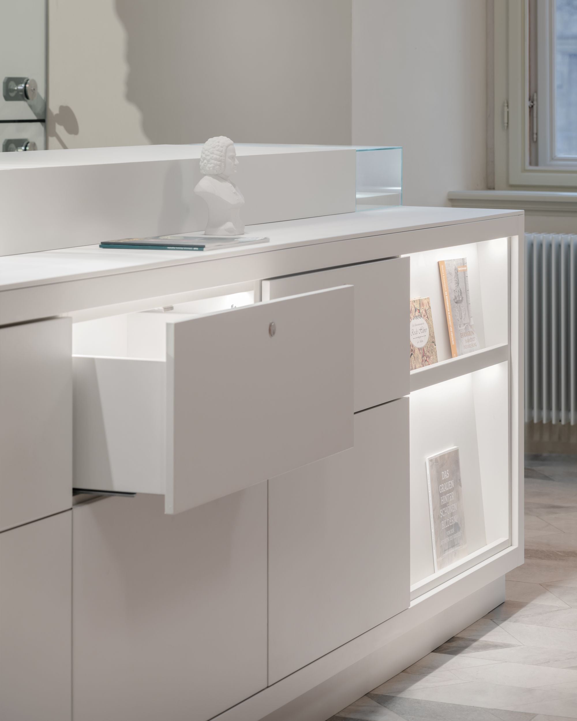 Ebenfalls von Körling Interior stammt die Metall-Garderobe, ein Präsentationsmöbel mit Schubkästen und beleuchteten Vitrinen-Hauben sowie weitere Ausbauten, Regale und Verkleidungen. Sämtliche Arbeiten wurden an die bauseitigen Bedingungen des Altbaus angepasst.